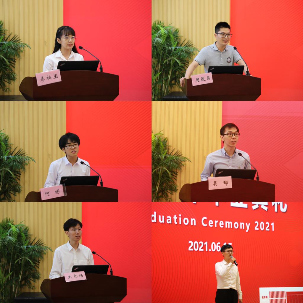 上午十点,毕业典礼在温馨青春的暖场视频中拉开序幕。考研代表李柏玉、就业代表何彬、考博代表王志玮先后分享了自己在校期间的成长与收获,回忆了学习生活中的美好与感动,表达了对学校、学院、老师们的感恩与感激,并表示将谨记老师们的谆谆教诲,不辜负老师们的悉心栽培!