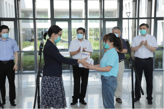 校党委常委、副校长张影陆为志愿者发放防疫物资