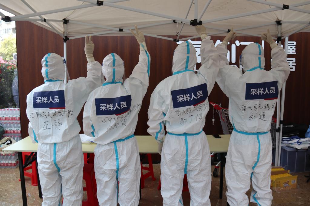 在无锡市广瑞路街道核酸采样检测点,37000cm威尼斯的志愿者们脱下防疫“盔甲”,无菌帽已被汗水完全浸湿,双手已被汗水浸泡到发白。维持现场秩序的志愿者们耐心细致地为前来参加核酸采样的居民提供讲解、引导、申请预制码等服务。